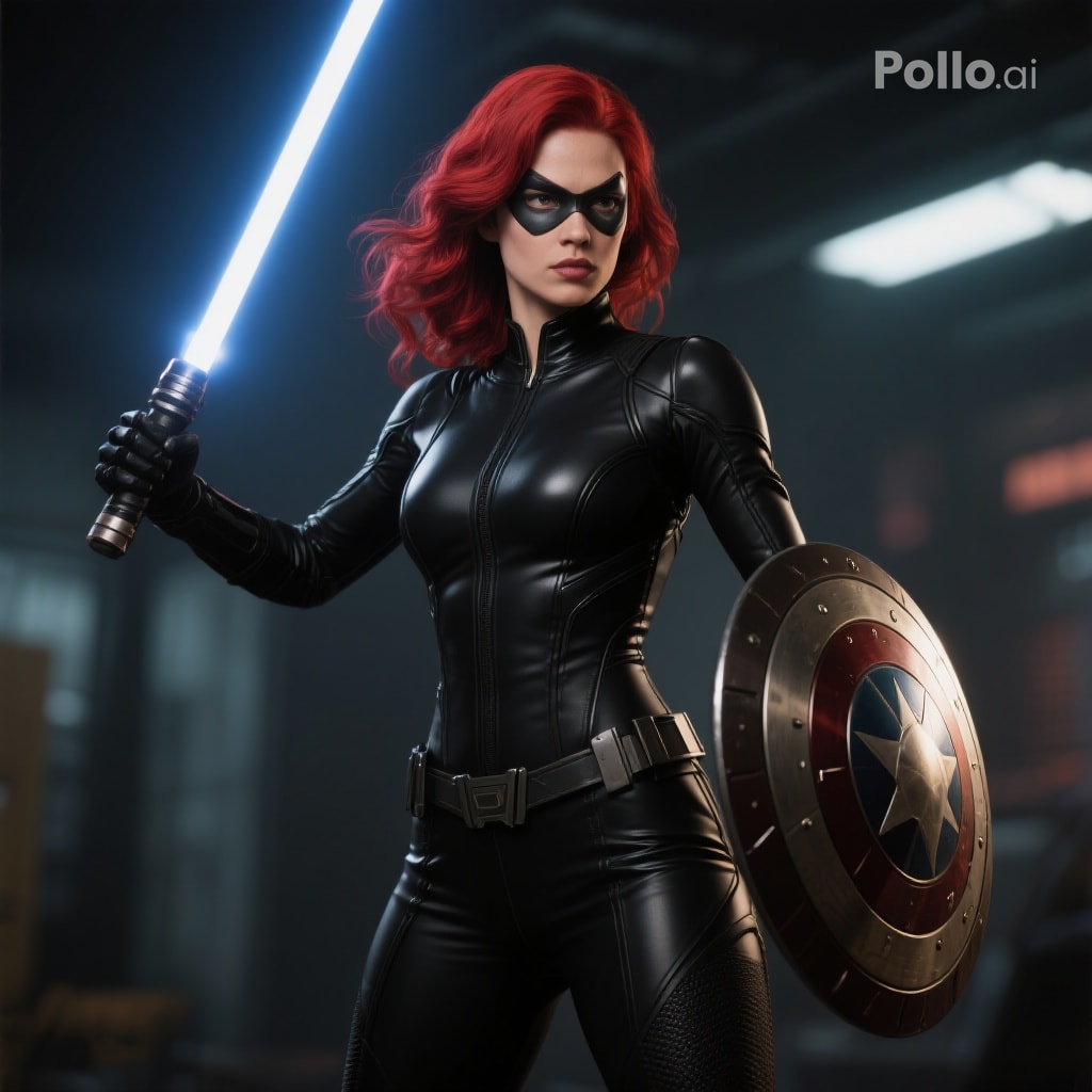 A que te meto dos hostias!!! Le he pedido a la IA que me hiciese a una super heroína, con el pelo rojo, esbelta, vestida de negro, con una espada láser y un escudo…y me ha disfrazado a Jean Grey de Black Widow con un antifaz de cat-woman el sable láser de star wars y el escudo de capitán américa…esta IA debe ser hombre…. Tenía ganas de hacer un post, sobre super heroínas.