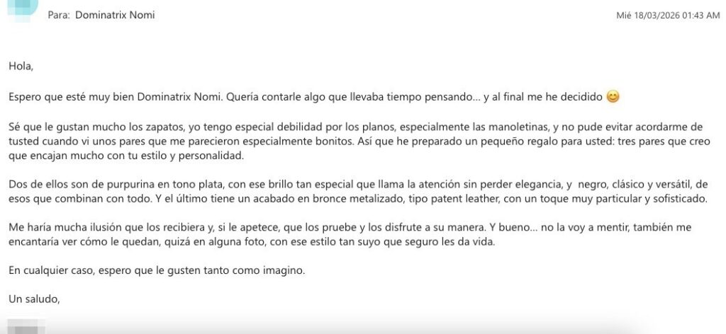 Esta semana, he recibido un mail (os lo dejo a pie de página), de un sumiso, fetichista de los zapatos planos, que me ha enviado tres pares de manoletinas, o ballerinas como se les conoce fuera de España.