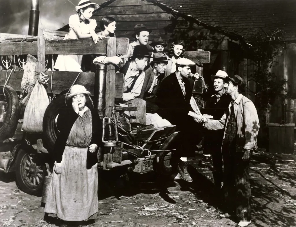 La película muestra una constante tensión entre el individuo y las estructuras económicas y sociales que lo rodean. Tom Joad, recién salido de la cárcel, se convierte en el eje moral de esta lucha. No es un revolucionario por ideología, sino por necesidad. Su evolución representa una toma de conciencia que nace del dolor, de ver cómo su familia se descompone, cómo los campos prometidos son campos de explotación, cómo el hambre no es una anomalía, sino una norma.