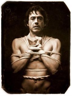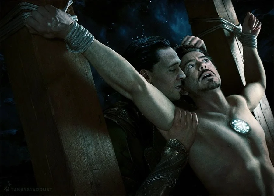 Loki (Tom Hiddleston) y Iron Man (Robert Downey Jr.) Si buscamos más imágenes, en sesiones de fotos encontraremos: cadenas, cuerdas, posturas incómodas, cuerpo en tensión o su mirada en silencio….por muchas gafas de sol, que le hagan parecer duro y arrogante…las cuerdas y las cadenas…siguen ahí.